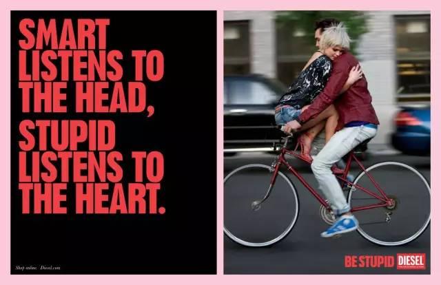 2010年Diesel发布了一组以“Be Stupid”为主题的广告,不仅有创意还有寓意。日常中,大家都在追求着“聪明人”的做法,但它却偏偏强调要be stupid。这组广告也充分传达了个性、叛逆、与众不同的品牌精神。